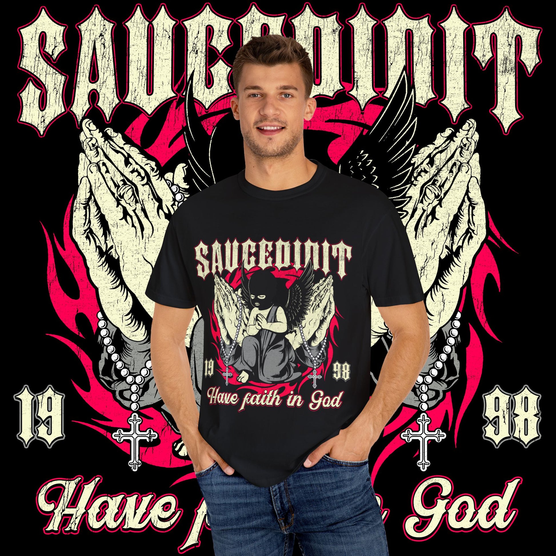 A unisex garment-dyed T-shirt with the words 'Have Faith In God' printed on the front. This tee exudes a sense of positivity and spiritual connection, making it a great addition to the wardrobe of someone who values faith and spirituality. Perfect for religious holidays, church events, spiritual gatherings, and everyday wear for those who want to share their beliefs with the world.