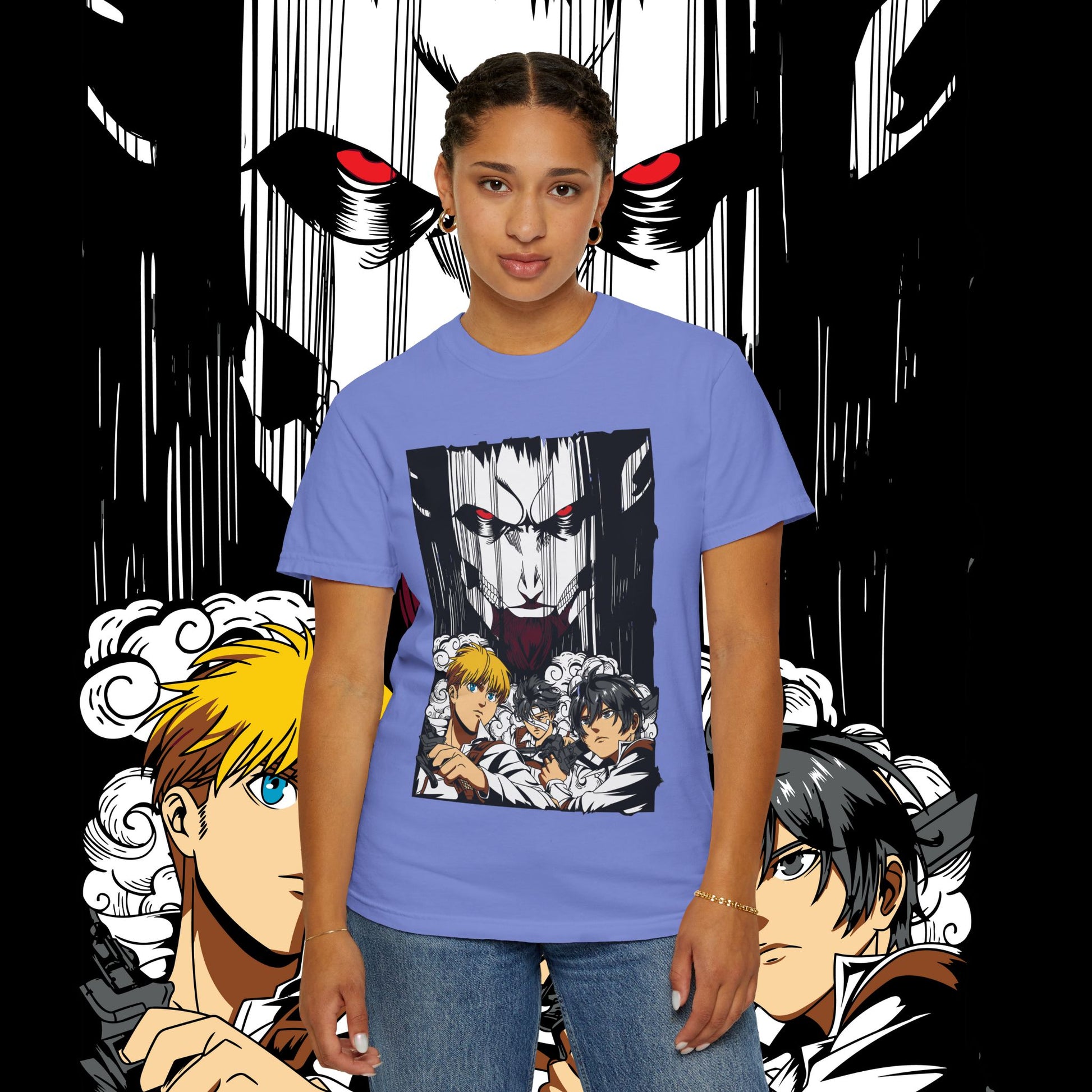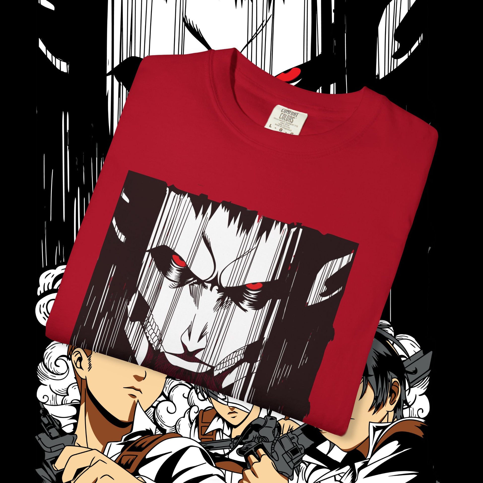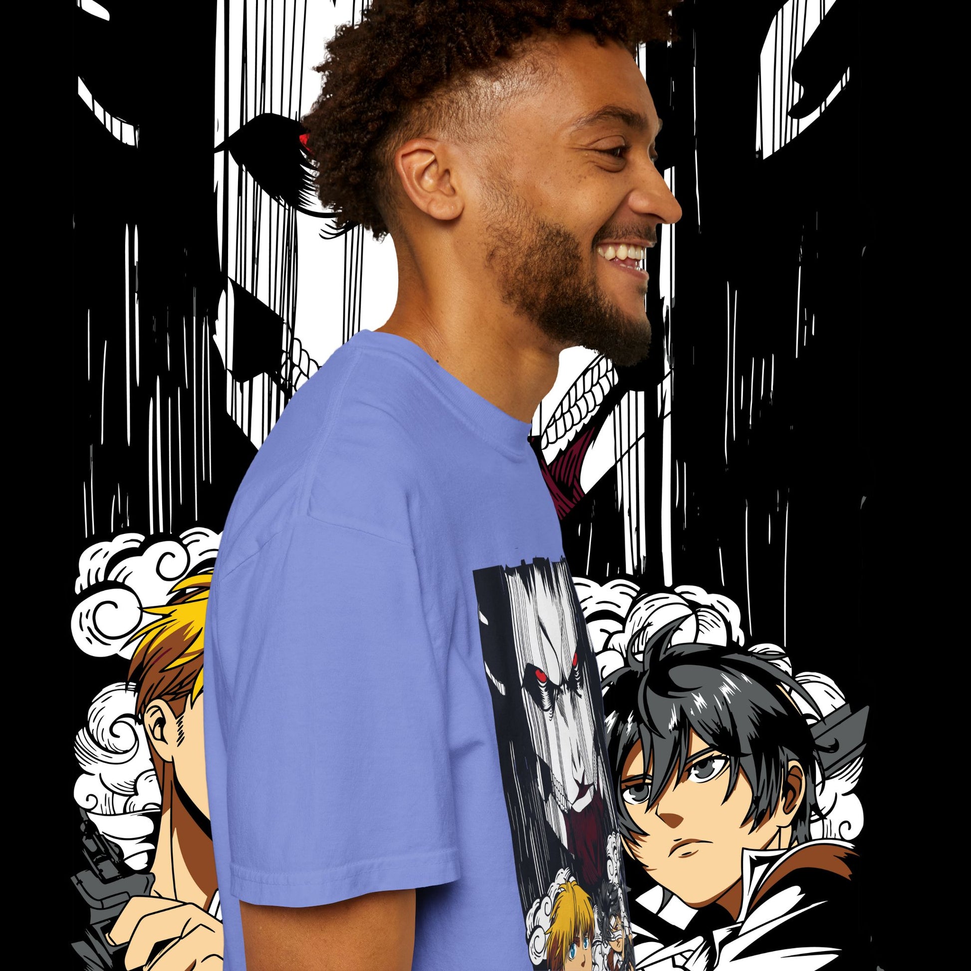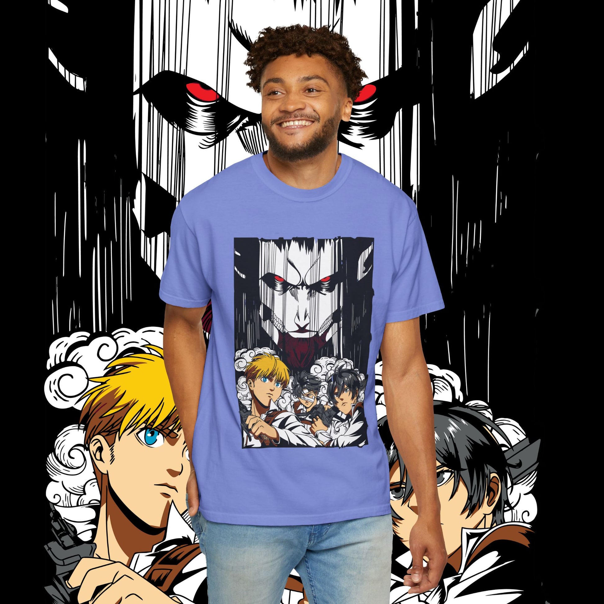 This heavyweight garment-dyed tee wears like a memory from the first pull-on. The artwork — a dramatic face-off between two towering figures in anime style — sits bold across the chest, drawing the eye with dynamic line work and raw energy. The soft, washed-in color and relaxed fit invite you to live in it: mornings at the comic shop, late-night marathon viewings, or conventions when you want something that feels worn-in and personal. The tubular knit and double-needle construction mean it stands up to repeated wear while the dense 6.1 oz cotton gives the print a substantial backdrop that holds color and detail. For anyone who collects character-driven art or wants a statement tee that reads like a page from a favorite story, this shirt brings that sense of scale and drama into everyday life.