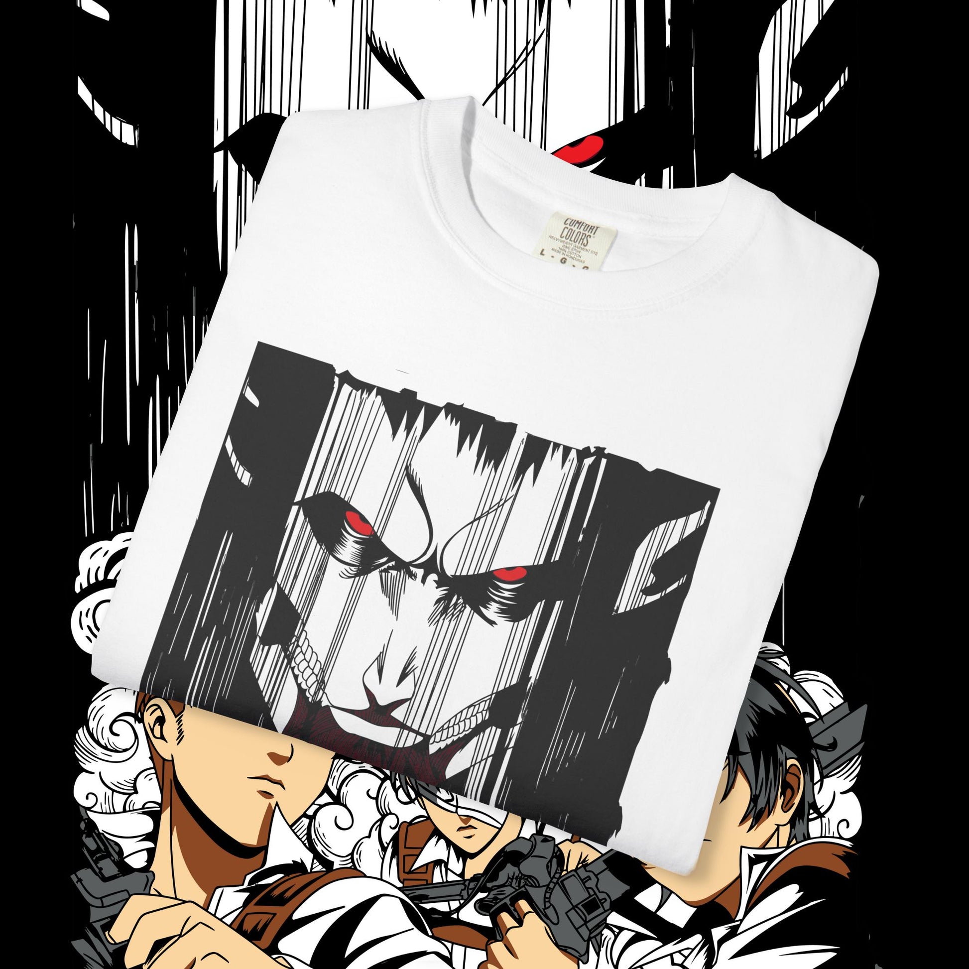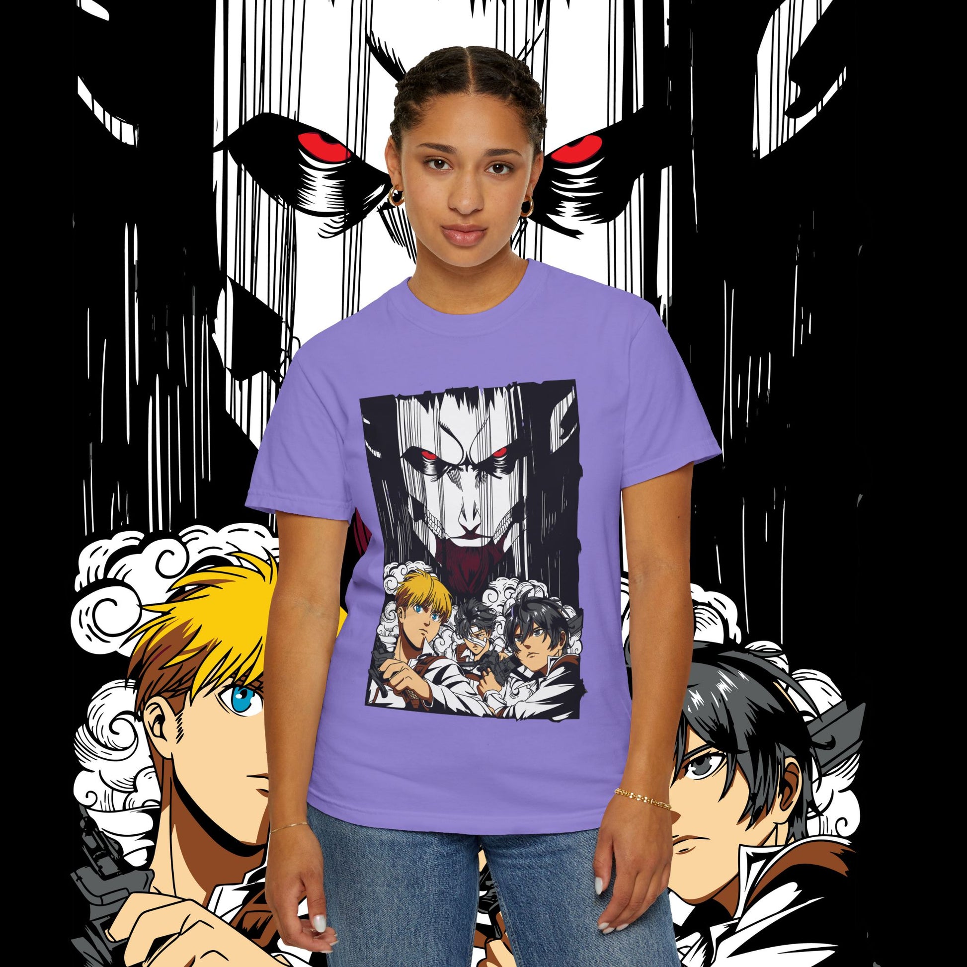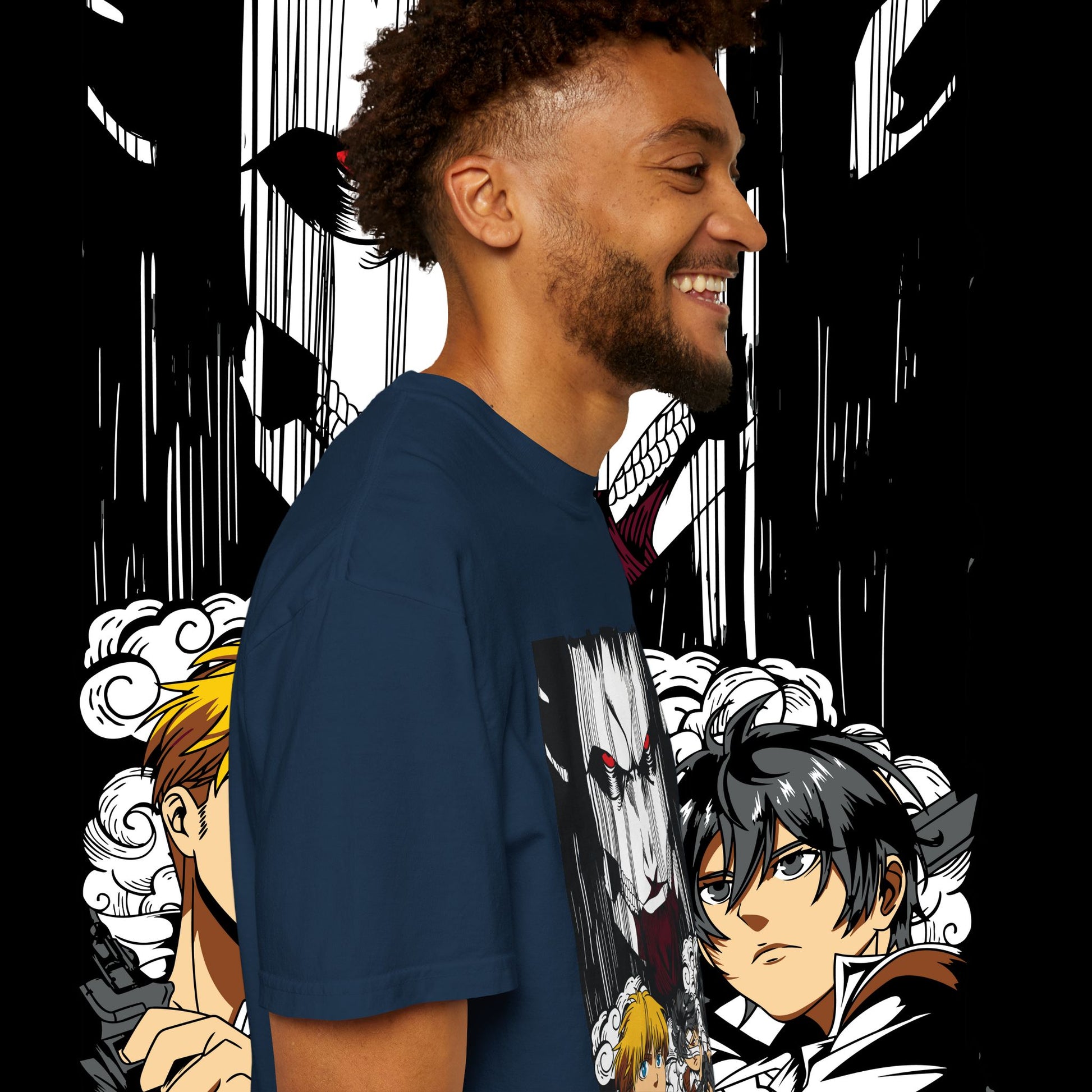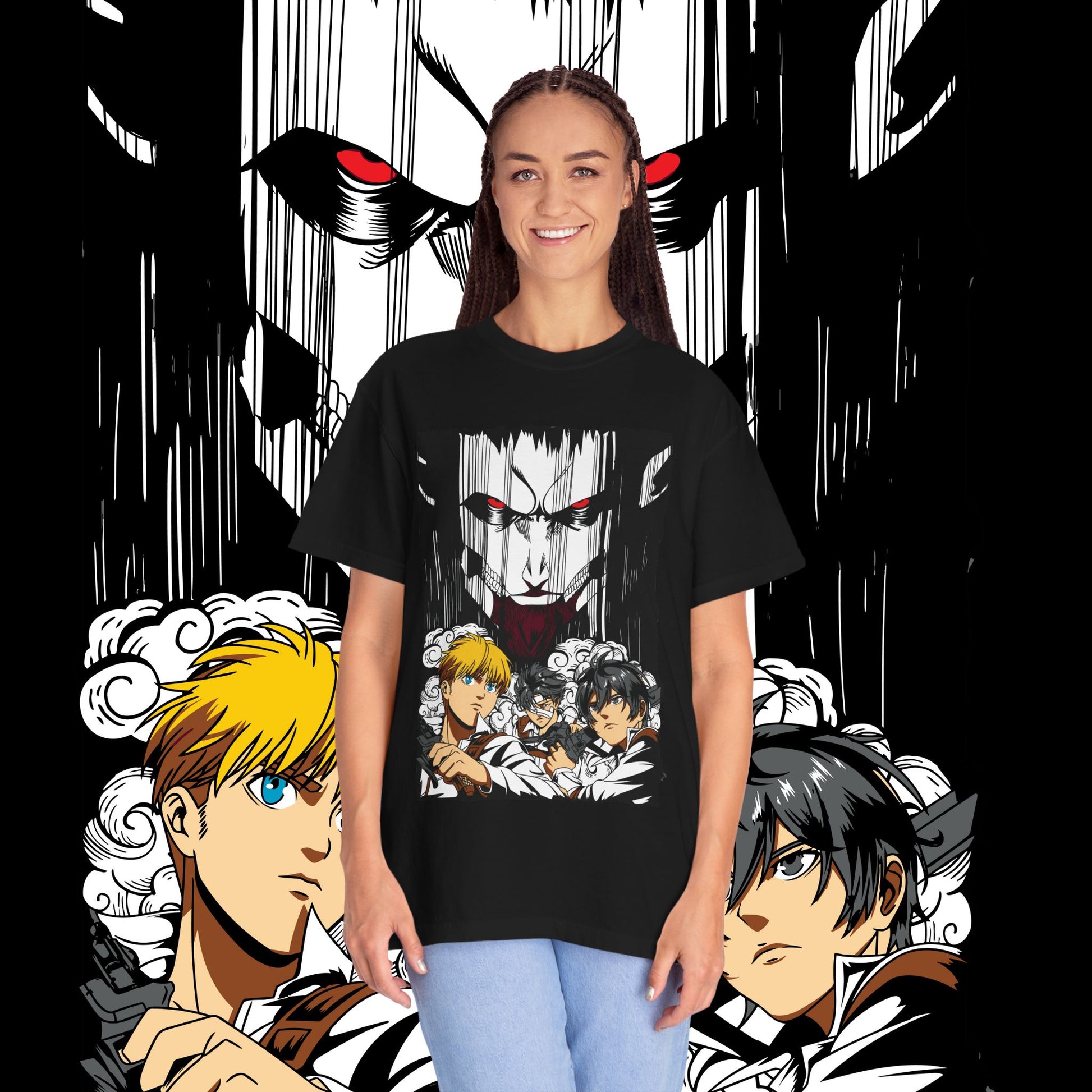This heavyweight garment-dyed tee wears like a memory from the first pull-on. The artwork — a dramatic face-off between two towering figures in anime style — sits bold across the chest, drawing the eye with dynamic line work and raw energy. The soft, washed-in color and relaxed fit invite you to live in it: mornings at the comic shop, late-night marathon viewings, or conventions when you want something that feels worn-in and personal. The tubular knit and double-needle construction mean it stands up to repeated wear while the dense 6.1 oz cotton gives the print a substantial backdrop that holds color and detail. For anyone who collects character-driven art or wants a statement tee that reads like a page from a favorite story, this shirt brings that sense of scale and drama into everyday life.