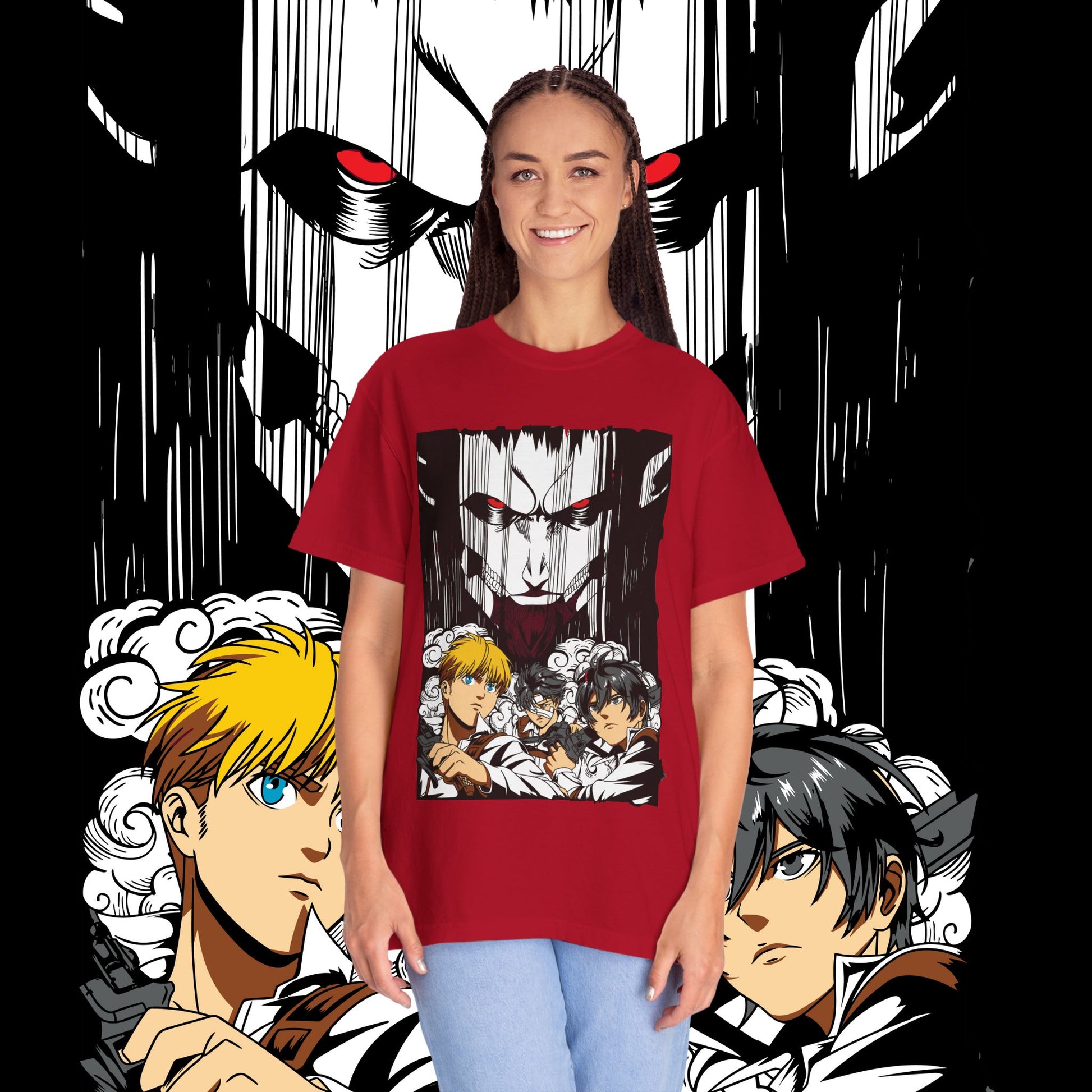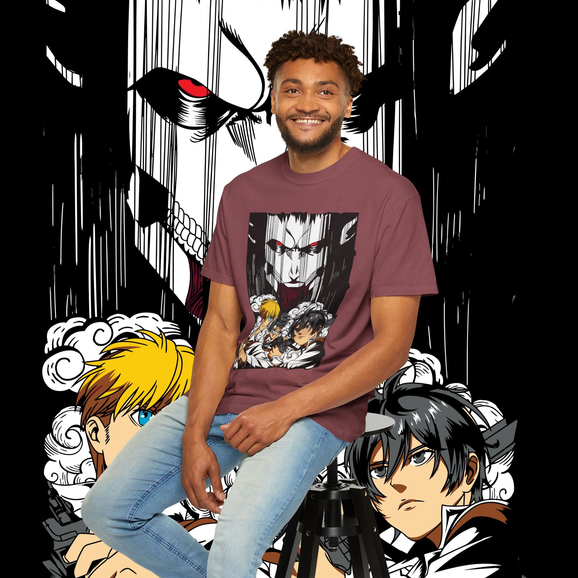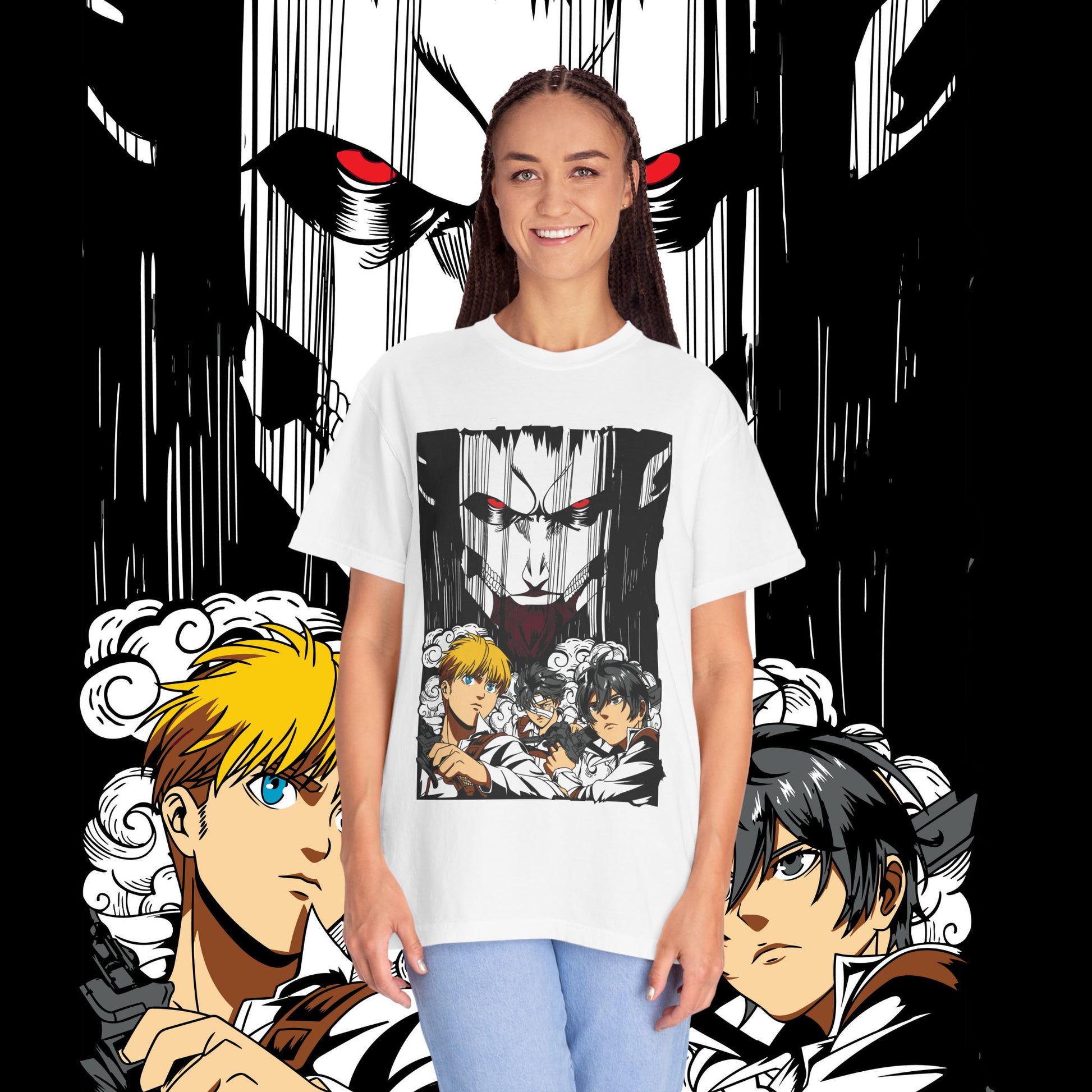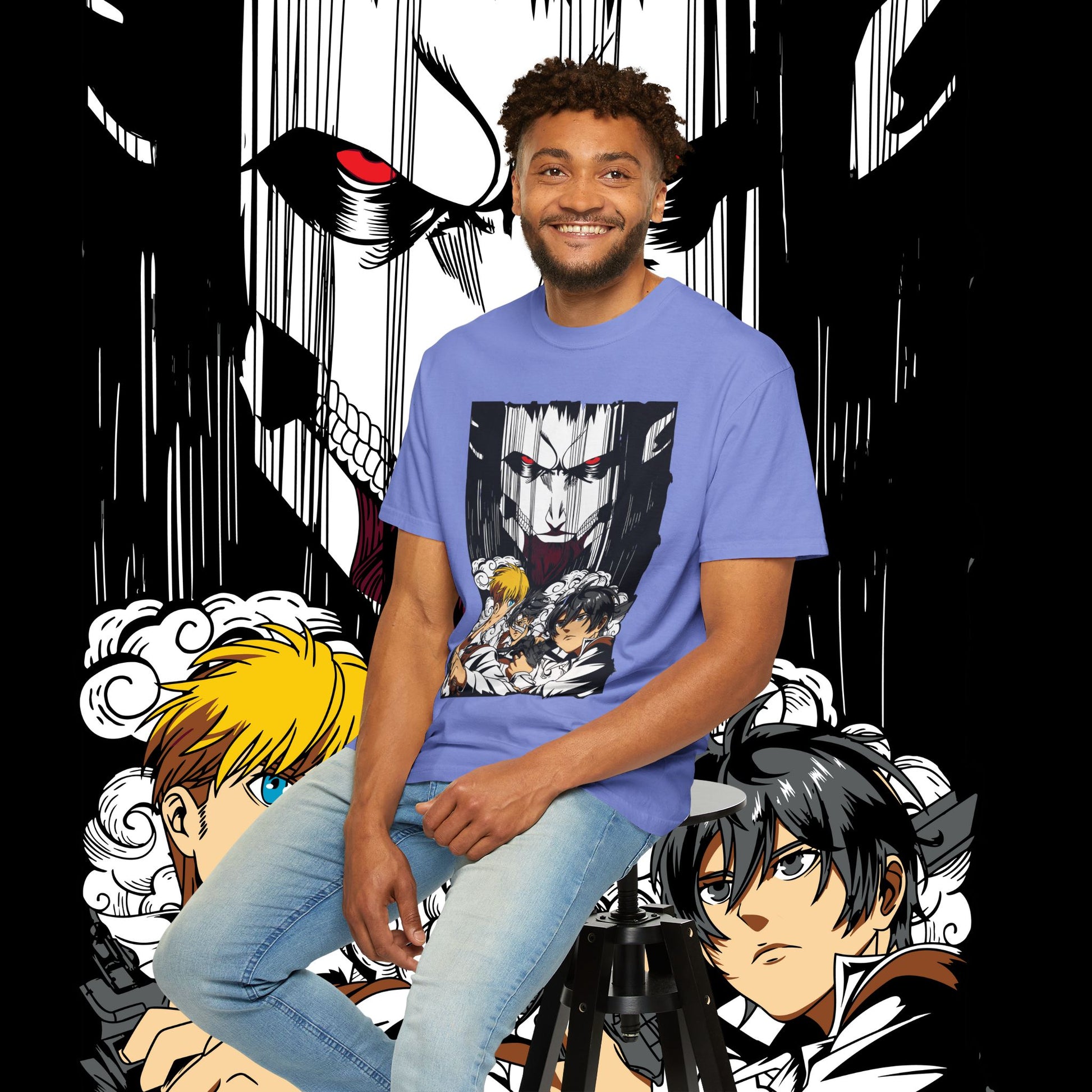 This heavyweight garment-dyed tee wears like a memory from the first pull-on. The artwork — a dramatic face-off between two towering figures in anime style — sits bold across the chest, drawing the eye with dynamic line work and raw energy. The soft, washed-in color and relaxed fit invite you to live in it: mornings at the comic shop, late-night marathon viewings, or conventions when you want something that feels worn-in and personal. The tubular knit and double-needle construction mean it stands up to repeated wear while the dense 6.1 oz cotton gives the print a substantial backdrop that holds color and detail. For anyone who collects character-driven art or wants a statement tee that reads like a page from a favorite story, this shirt brings that sense of scale and drama into everyday life.