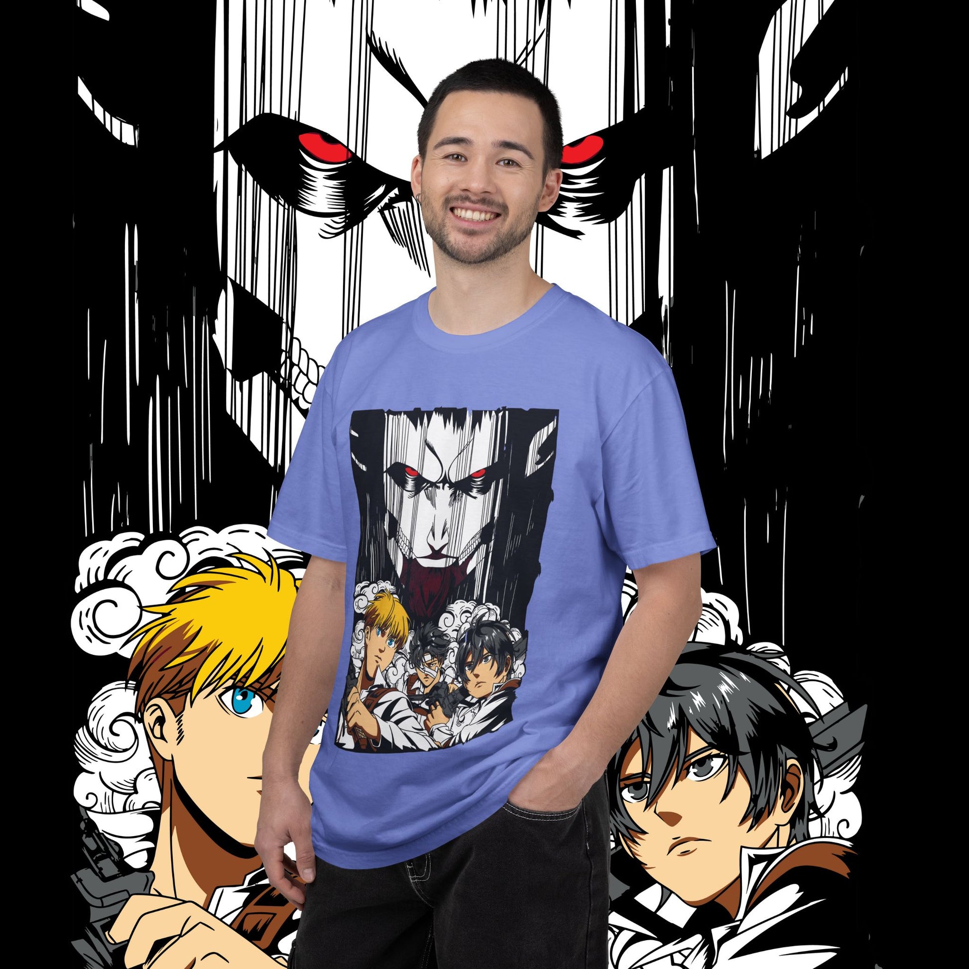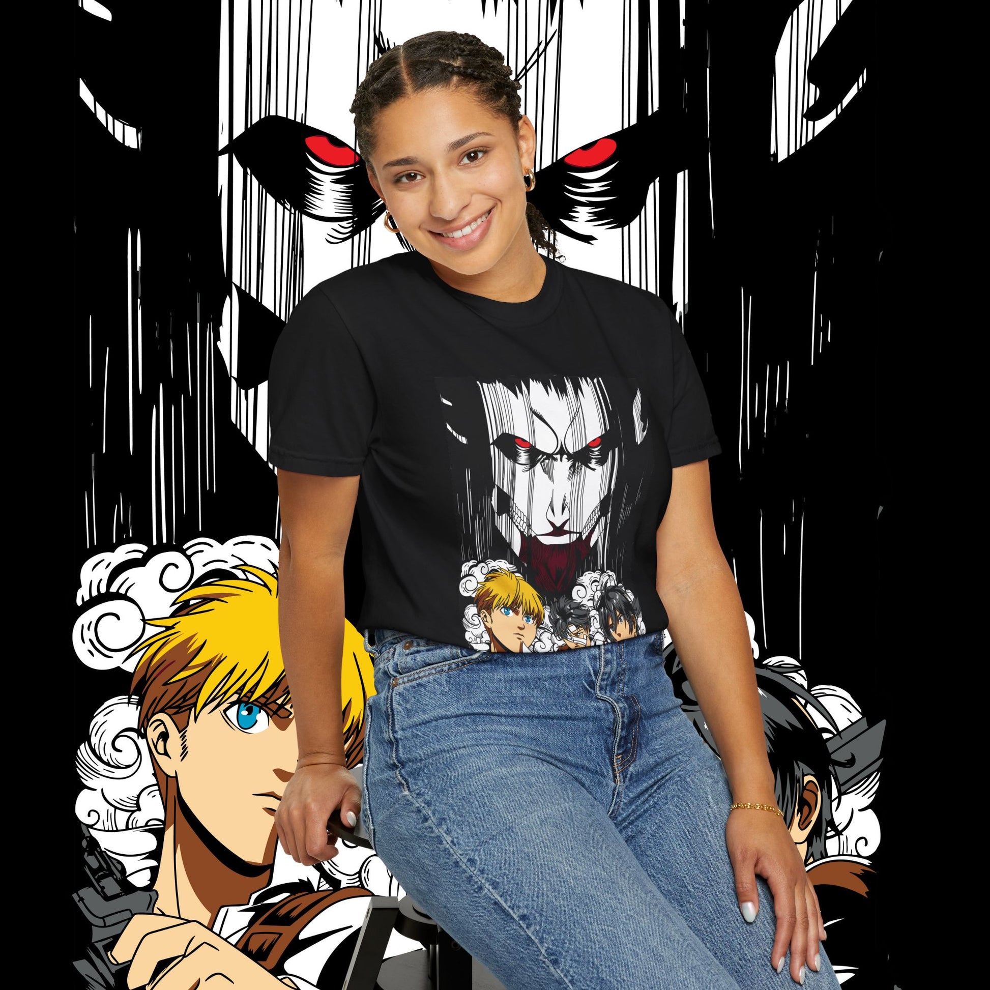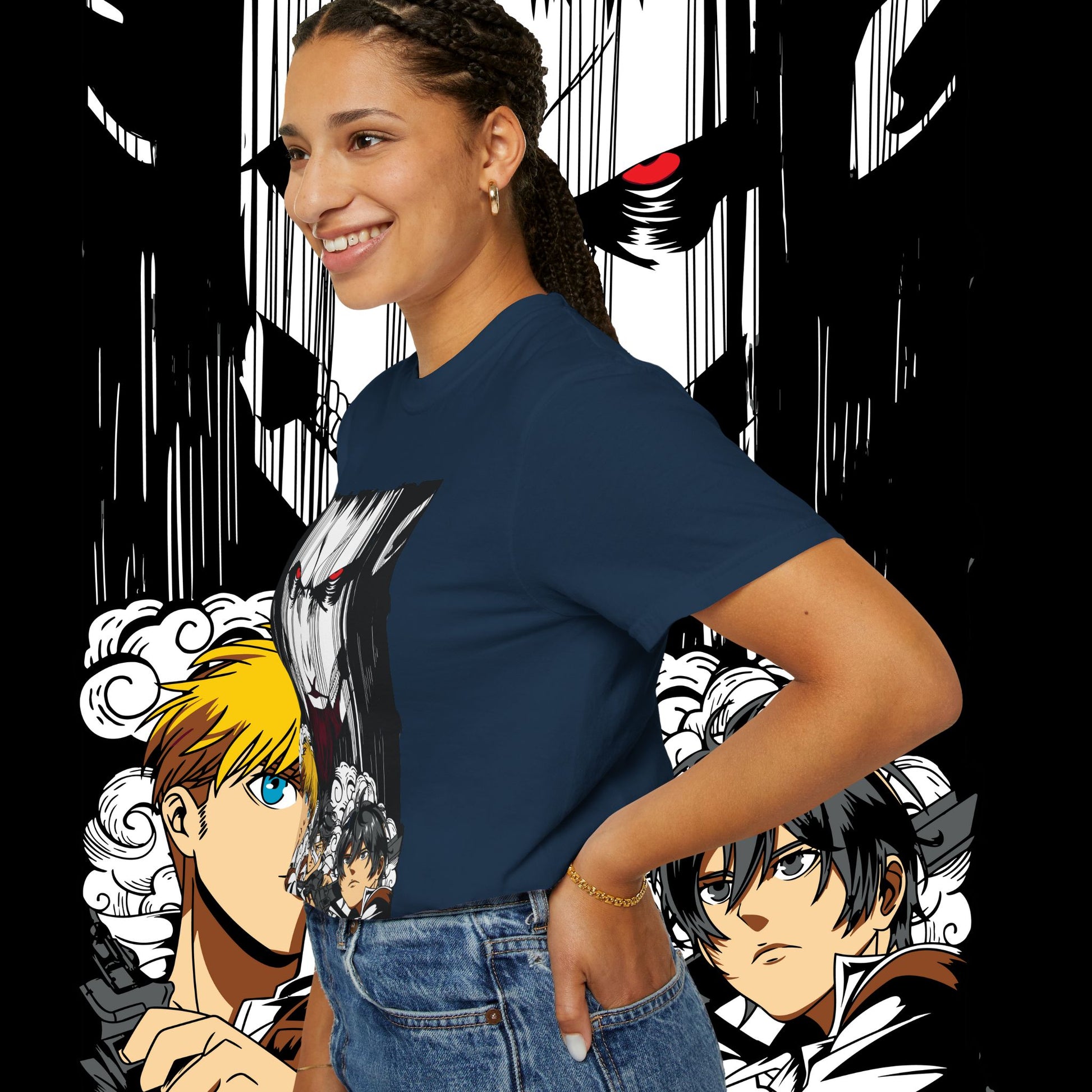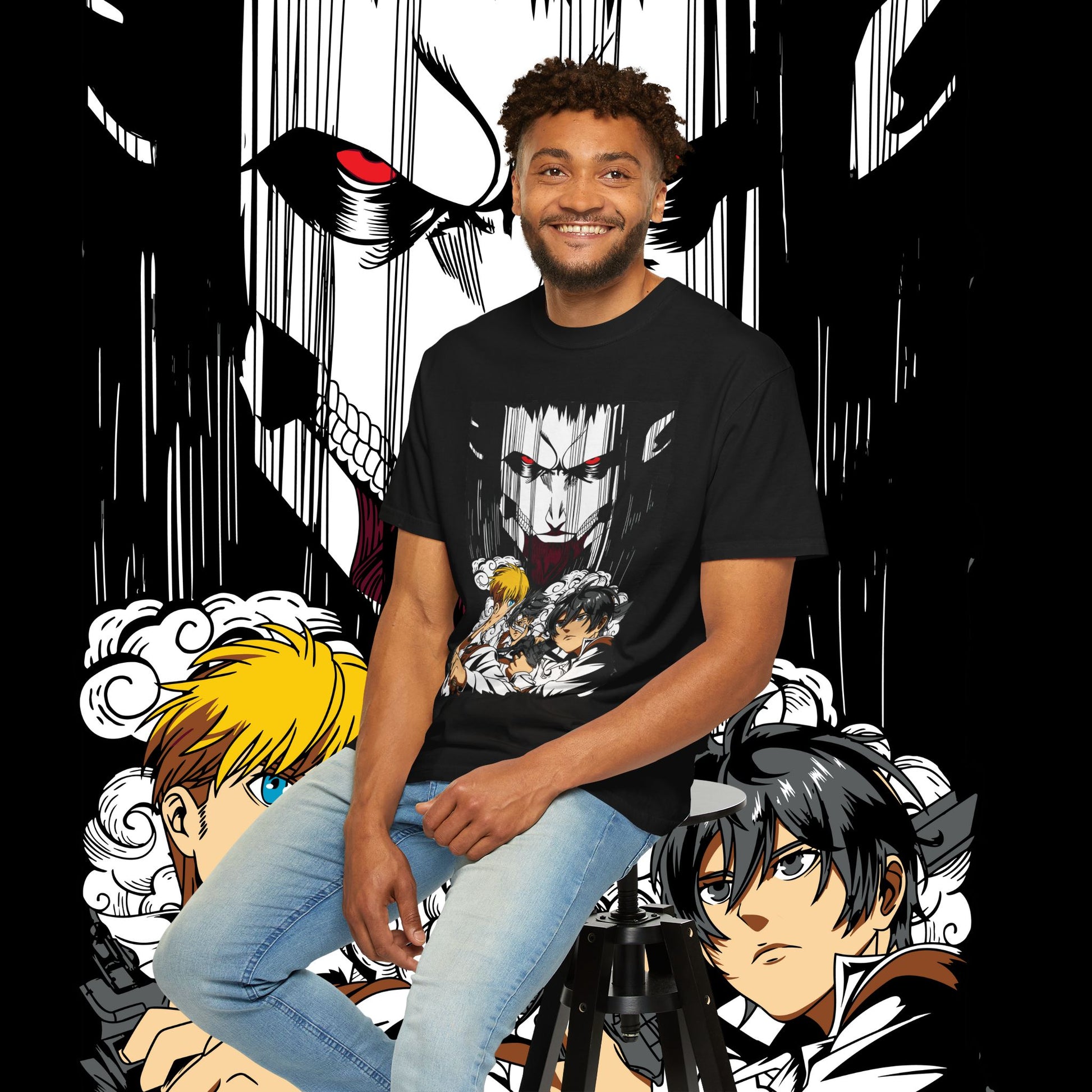 This heavyweight garment-dyed tee wears like a memory from the first pull-on. The artwork — a dramatic face-off between two towering figures in anime style — sits bold across the chest, drawing the eye with dynamic line work and raw energy. The soft, washed-in color and relaxed fit invite you to live in it: mornings at the comic shop, late-night marathon viewings, or conventions when you want something that feels worn-in and personal. The tubular knit and double-needle construction mean it stands up to repeated wear while the dense 6.1 oz cotton gives the print a substantial backdrop that holds color and detail. For anyone who collects character-driven art or wants a statement tee that reads like a page from a favorite story, this shirt brings that sense of scale and drama into everyday life.