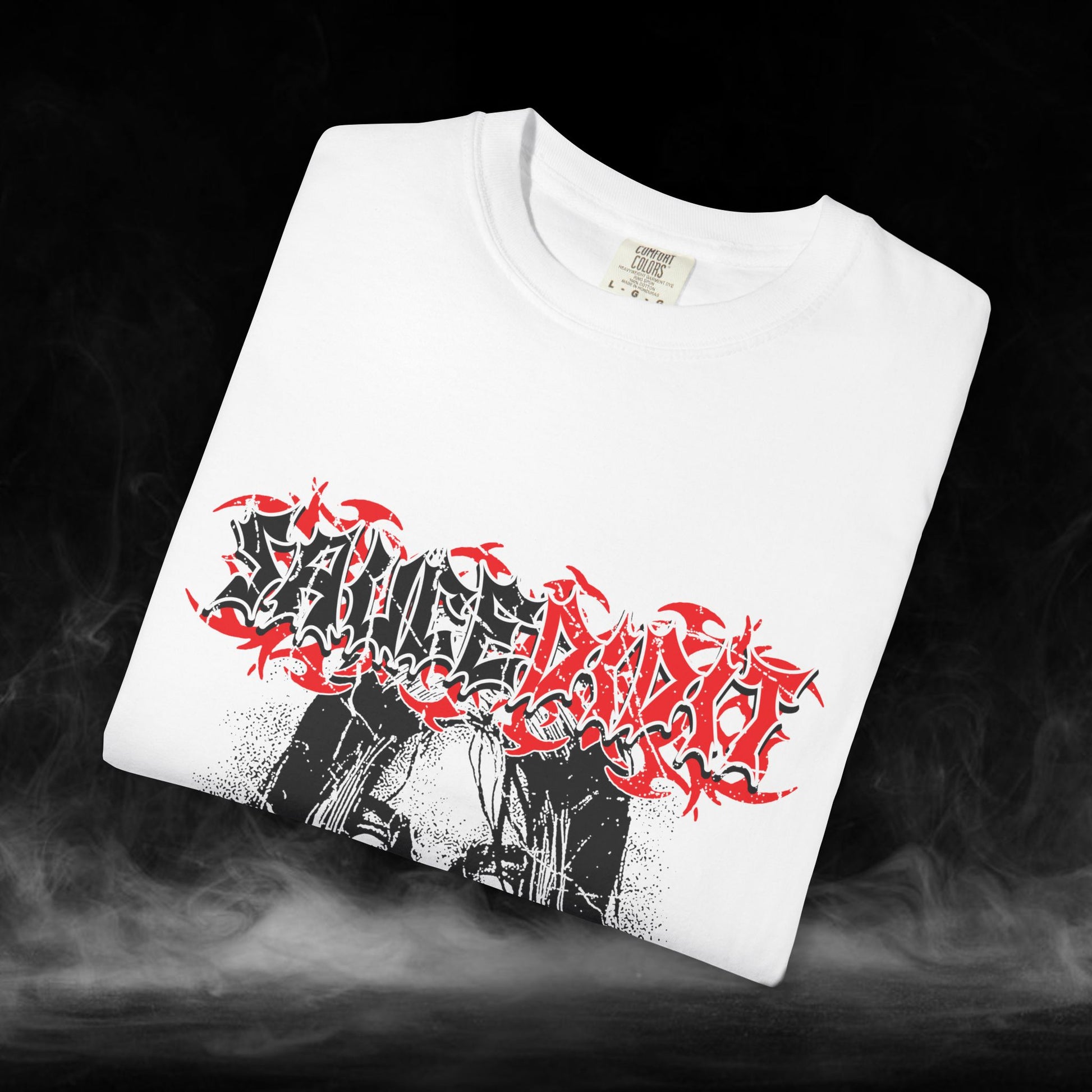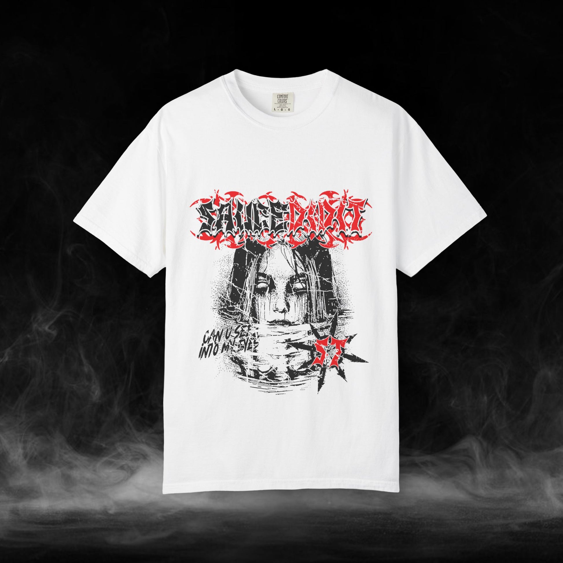 A unisex garment-dyed T-shirt with the design 'can u see into my eyes'. This T-shirt gives off a cool and mysterious vibe, perfect for casual outfits and everyday wear. Ideal for adults looking for a unique and eye-catching piece to add to their wardrobe. Relevant for occasions like concerts, festivals, and casual hangouts with friends.