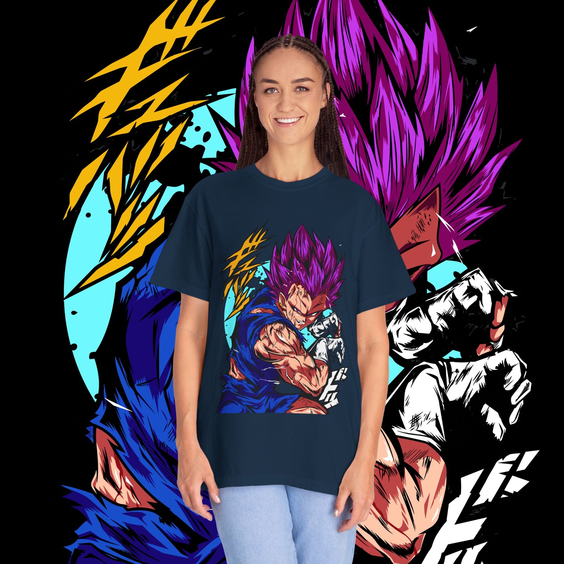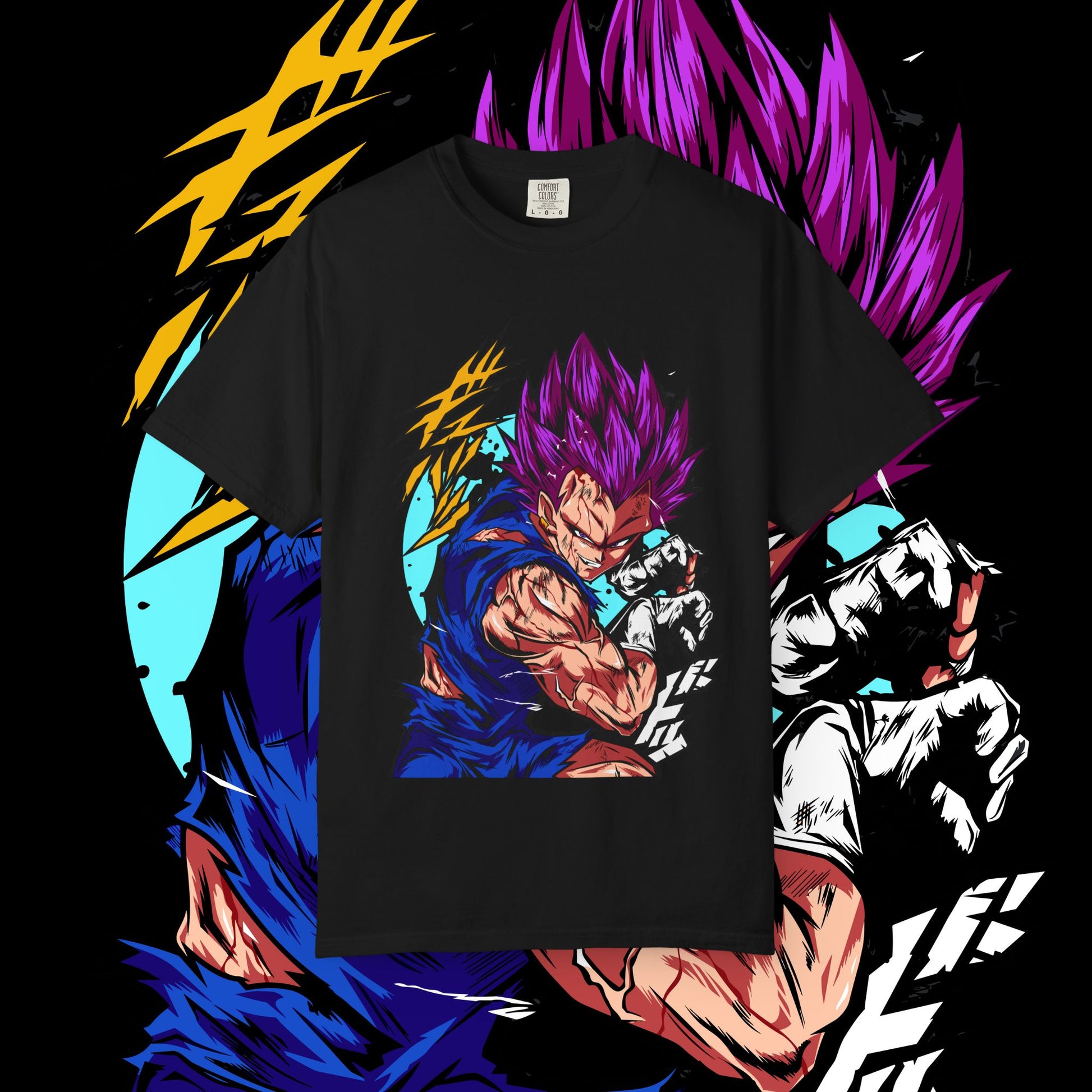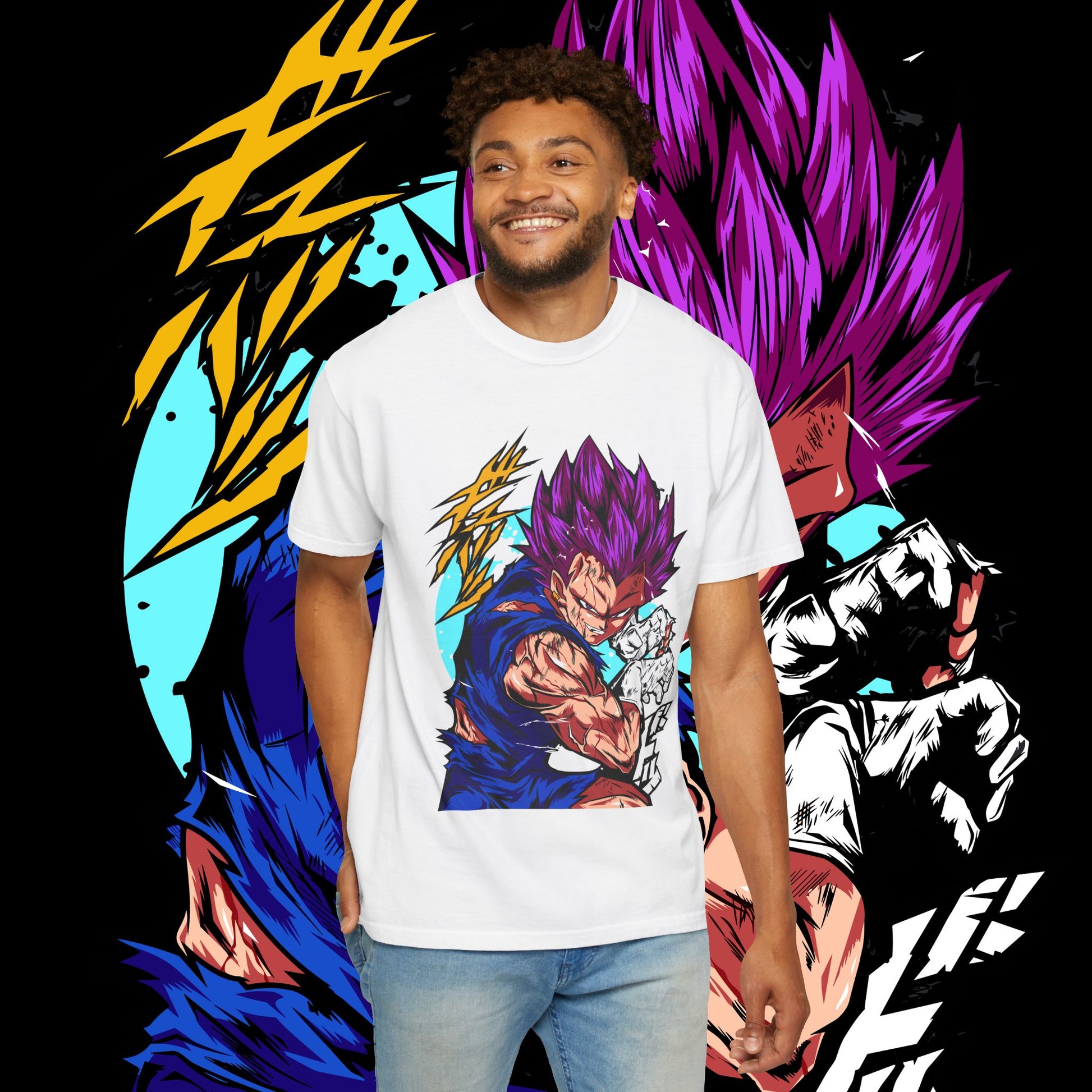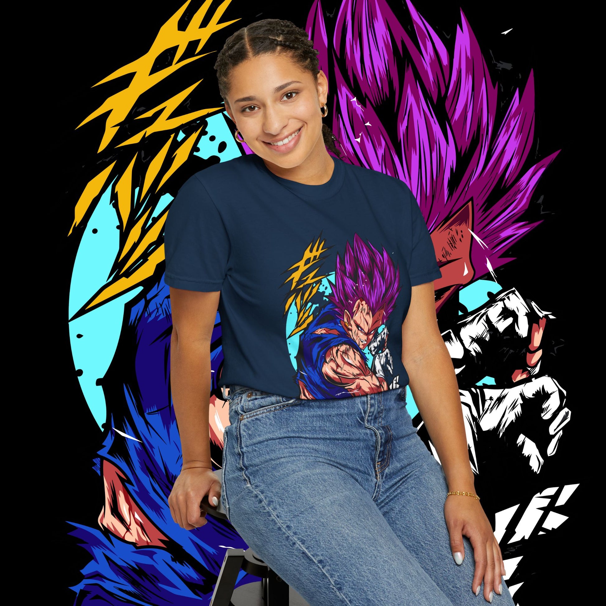 Feel the raw energy freeze in the air before a strike. This garment-dyed tee carries a quiet weight — soft, broken-in color and a heavyweight hand that sits like armor. The graphic captures Vegeta in a sharp fighting stance: compact, coiled, and focused. Wear it layered under a jacket for city streets, or loose at a weekend hangout while you talk power levels and spar over strategy. It’s made to move with you — not flashy, but confidently intense. The muted dye tones let the art stand out without shouting, so the shirt reads like an insider nod to fellow fans rather than a billboard. Comfortable enough for long conventions, durable enough for everyday training sessions or late-night anime marathons.